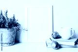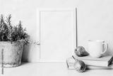 White vertical blank wooden frame mockup. Composition of rosemary herb in old metal flower pot, books, cup of coffee and pears on white table. Home decor. Rustic summer poster product design.