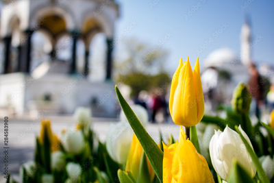 Yellow tulips and German Fountain in Sultanahmet Square in Istanbul