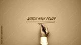 Male hand writing a Words have power sign with black marker on blue background.
