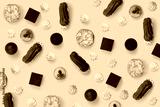 Decoration made of various sweets. Top view. Pink pastel bacground.