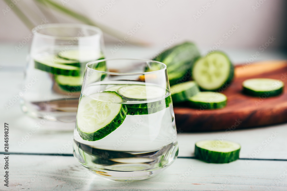 Water infused with sliced cucumber in a drinking glass