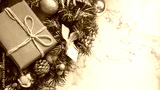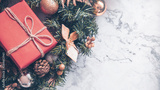 Christmas background with decorations and gift boxes on white marble.