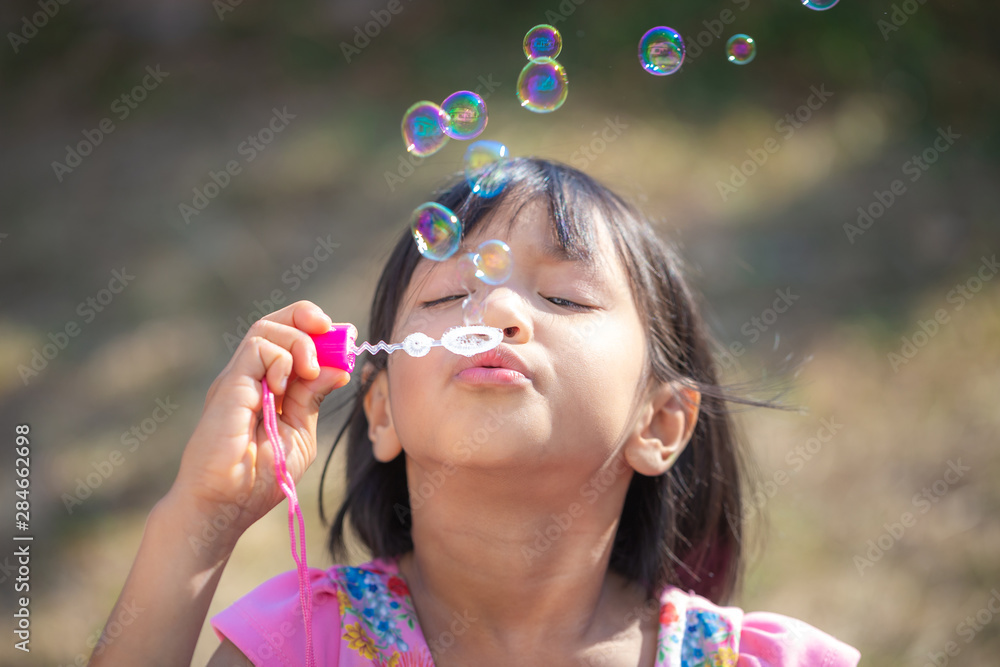 Cute little Asian girl playing soap bubbles at park, outdoors