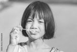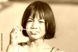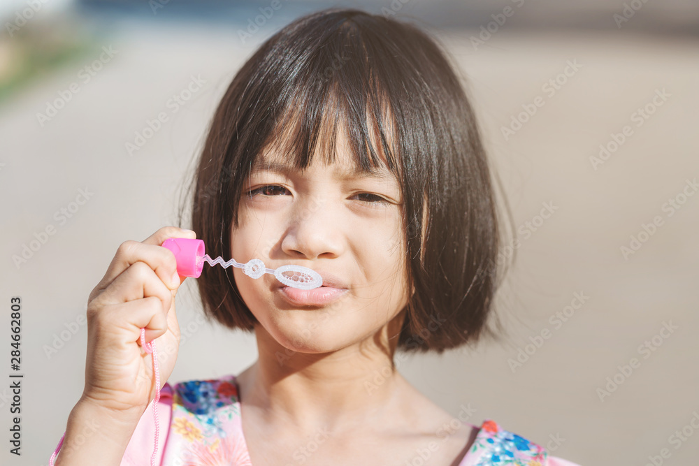 Cute little Asian girl playing soap bubbles at park, outdoor