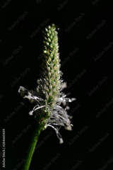 Closeup of an isolated flowering grass plant in front of dark background with water drops