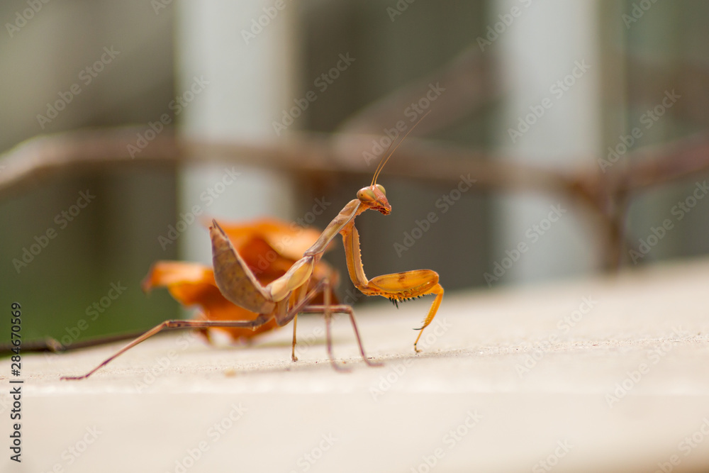 European Praying Mantis / Mantis Religiosa in brown color near to a brown dry leaf. View from back.