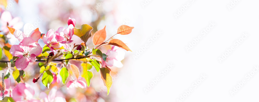 Springtime sunny day floral mockup with blooming pink flowers branch. Soft light natural freshness spring nature blossoming landscape. macro view, copy space