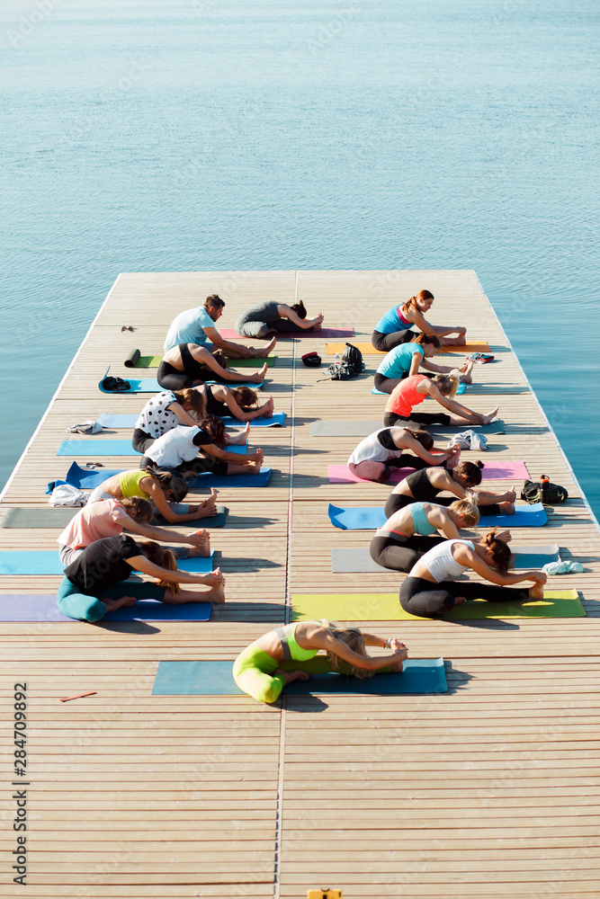 A big group of people attending yoga classes on a pontoon near the lake.