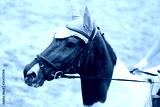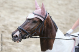 Headshot close up of a dressage horse during competition event