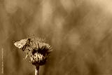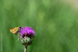 A small brown butterfly is sitting at a purple blossom in front of green background