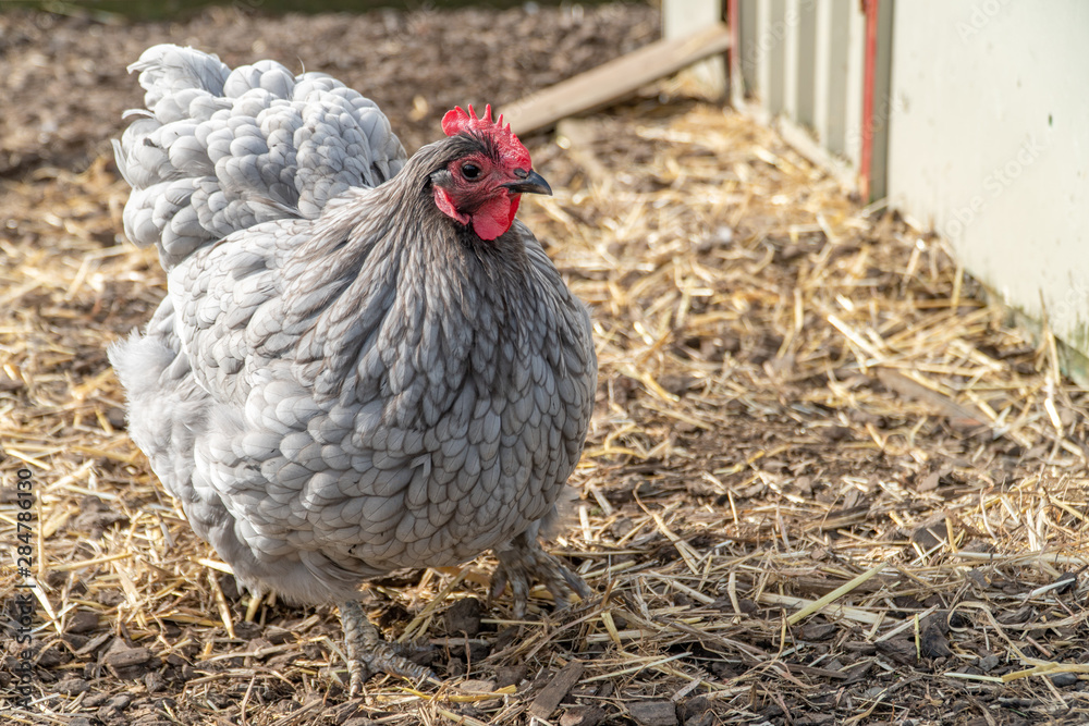 A Chochin Hen in front of a Hen House Foraging in Straw
