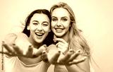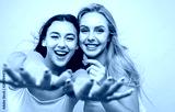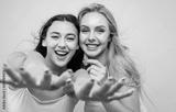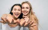Joyful cute girlfriends in white tank tops smiling and stretching hands to camera isolated white background
