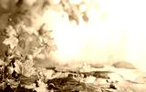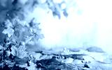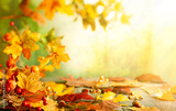 Thanksgiving or autumn scene with leaves and berries on wooden table. Autumn background with falling leaves.