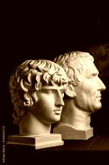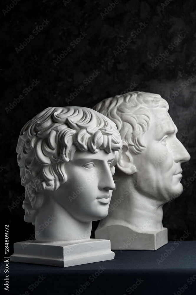 Gypsum copy of ancient statue Augustus and Antinous head on dark textured background. Plaster sculpture mans face.