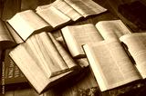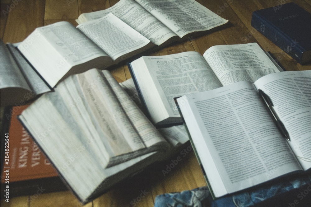 Closeup shot of opened books with a pen and the holy bible on the side on a wooden surface