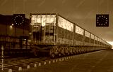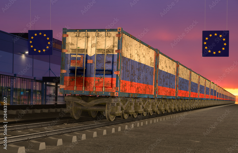 railway wagons with containers with the Russian flag entering the European Union