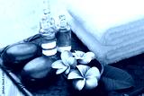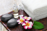 tropical spa resort concept; plumeria, hot stones, towels, and massage oils