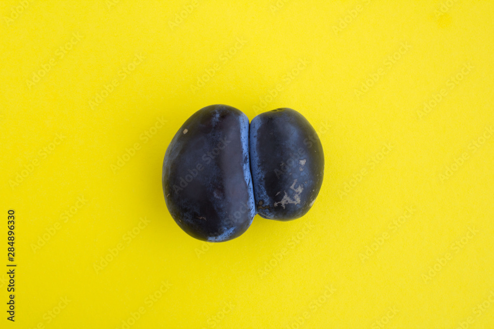 Ugly food. Ugly blue plum in the center of the yellow background. Top view. Copy space.