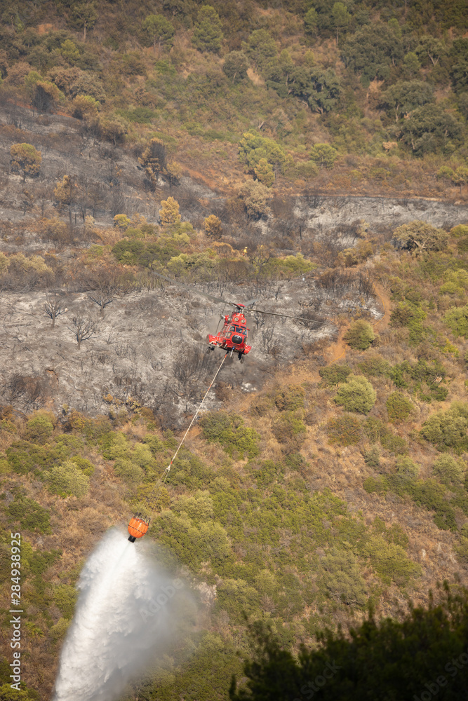 Helicopters putting out a forest fire in the Sierra Bermeja mountains in Estepona, Spain