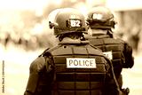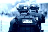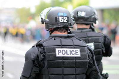 Police officers in riot gear overseeing a crowd of protestors.