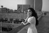 Beautiful girl in the white dress waiting along the sea promenade. Elegance and tenderness concept