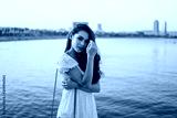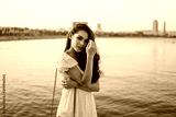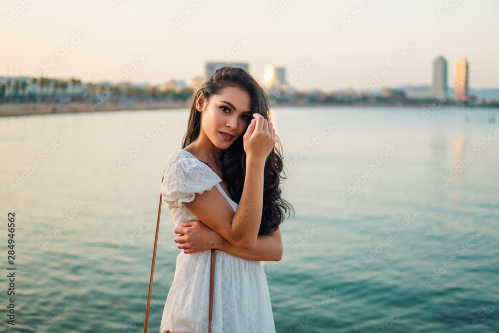 Beautiful girl in the white dress posing and waiting along the sea promenade. Elegance and tenderness concept