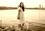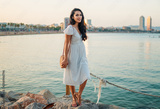 Beautiful girl in the white dress waiting along the sea promenade. Elegance and tenderness concept