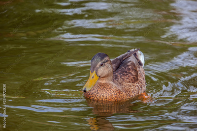 Wild migratory duck swims in the water, City park, pond, river or lake, close-up