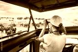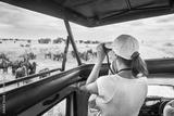 Woman on an African safari travels by car with an open roof and watching wild zebras and antelopes