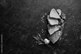 Raw tuna fillet. Seafood on a black stone background. Top view. Free copy space.