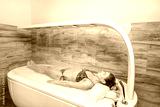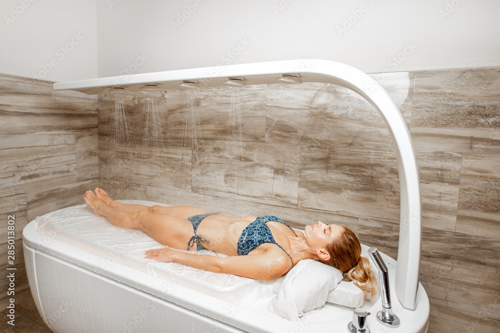 Woman lying under the hot shower in the spa
