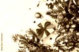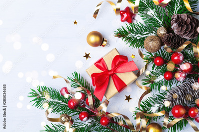 Golden gift or present box, snowy fir branches, conifer cones, Christmas decoration and red berry on light table top view.