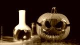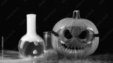 Halloween pumpkin with scary face and laboratory glassware on black background. Jack o lantern wearing laboratory glasses with mist pouring from mouth and flasks.