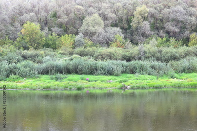 River bed in summer on background of green grass and green trees in fine weather