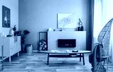 Stylish living room interior with pastel pink sofa, wooden coffee table and eco fireplace