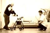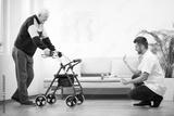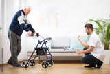 Elderly grandfather with walker trying to walk again and helpful male nurse supporting him