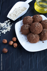 Energy balls with hazelnut, cocoa, oats cereals and honey on the white plate on the black wooden background. Vertical location.