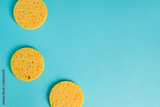 yellow round sponges on pastel blue background, Facial care. Cosmetic device. Deep skin cleansing.