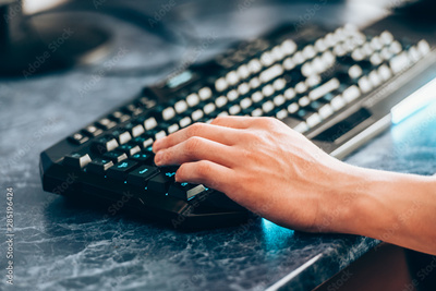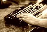 Hand man on the keyboard - tinted. The concept of computer technology and communication.