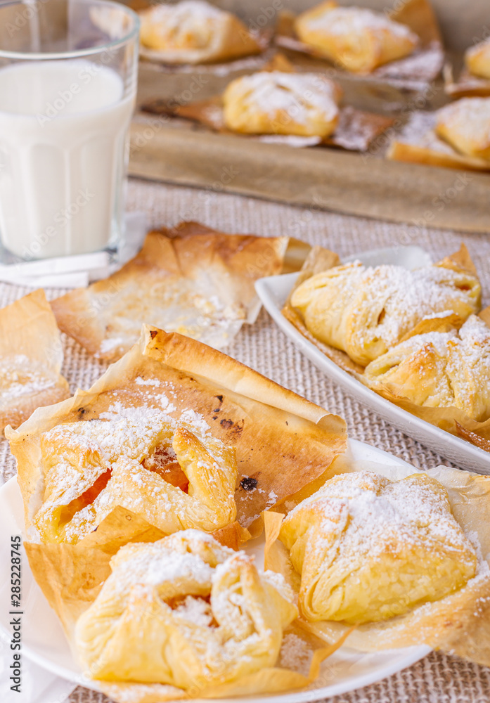 Ciasteczka domowej roboty. Ciasto francuskie ze sliwka. Bezglutenowe wypieki. Slodki deser. Ciastka z cukrem pudrem.