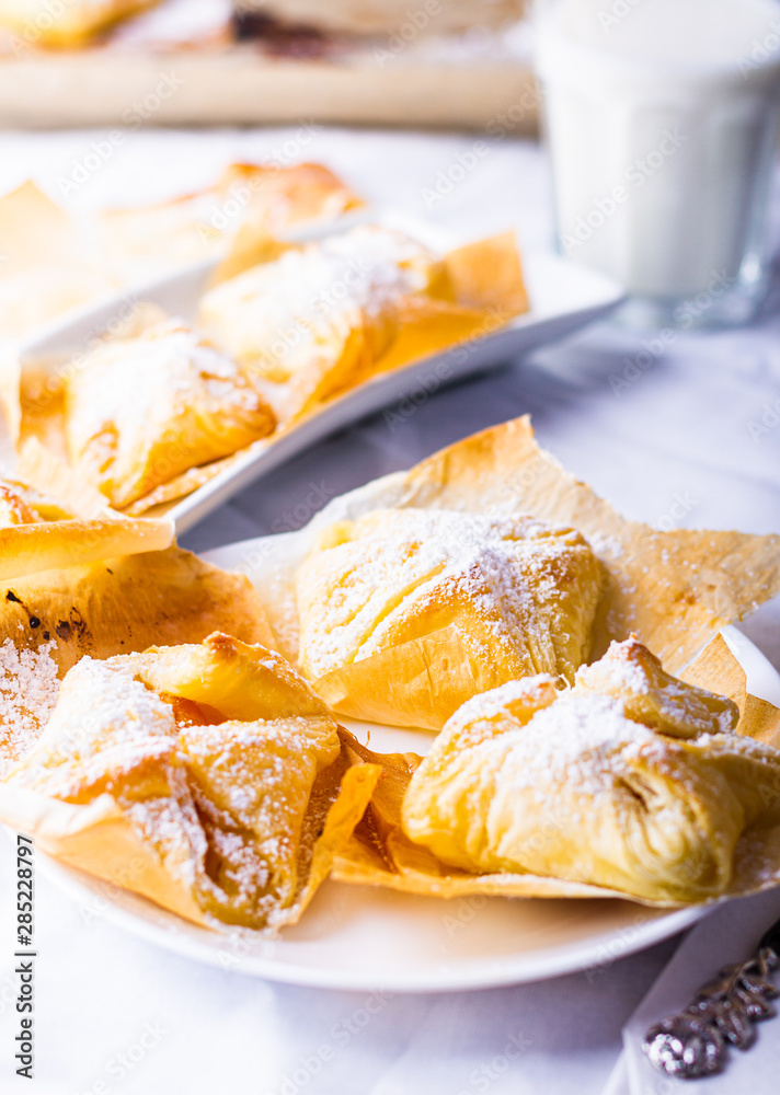 Ciasteczka domowej roboty. Ciasto francuskie ze sliwka. Bezglutenowe wypieki. Slodki deser. Ciastka z cukrem pudrem.