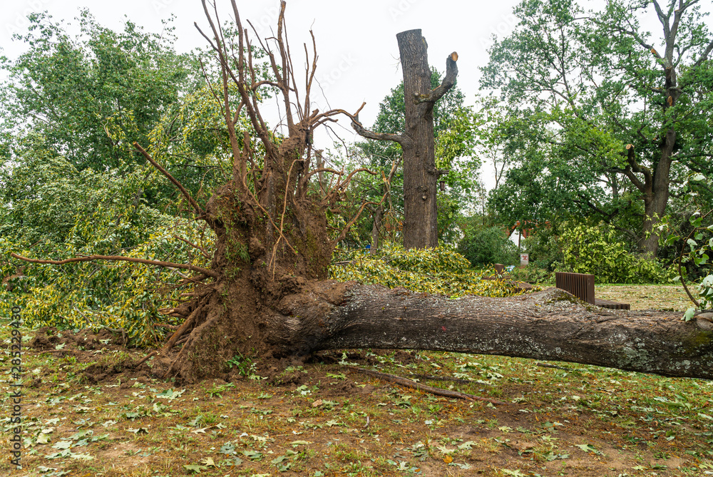 Zniszczenia po burzy. Efekt burzy gradowej. Sila Natury. Park w Bawarii. Polamane drzewa w Niemczech. Park miejski.