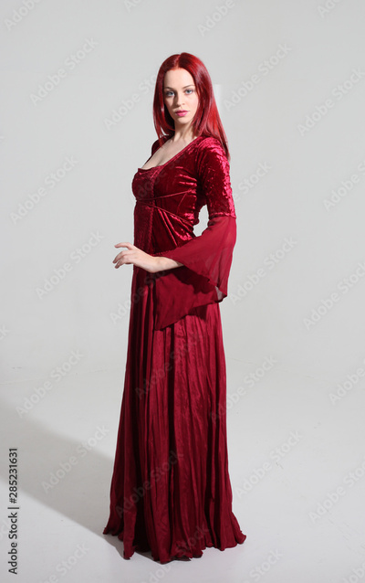 full length portrait of a girl wearing a red medieval fantasy gown, Standing pose on a grey studio background.