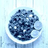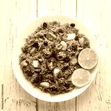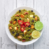 Palak Paneer Biryani at white wooden background. Palak Paneer Biryani is vegetarian indian cuisine dish with spinach, paneer cheese, basmati rice, spices, nuts and raisins