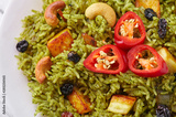 Palak Paneer Biryani at white wooden background. Palak Paneer Biryani is vegetarian indian cuisine dish with spinach, paneer cheese, basmati rice, spices, nuts and raisins. Close Up view