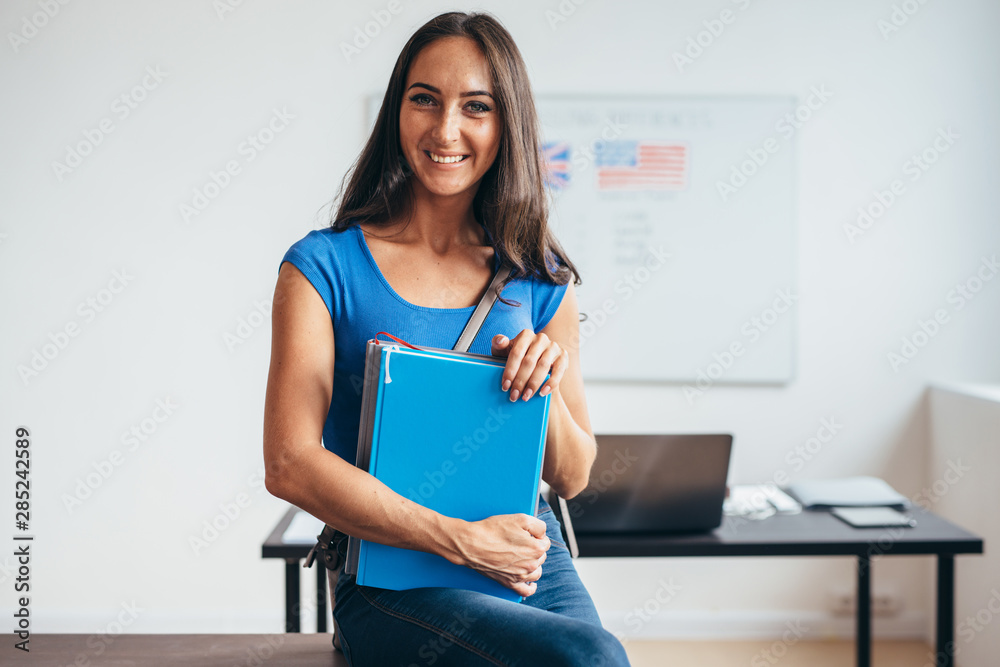 Female student sitting at table smiling and looking at camera.