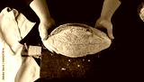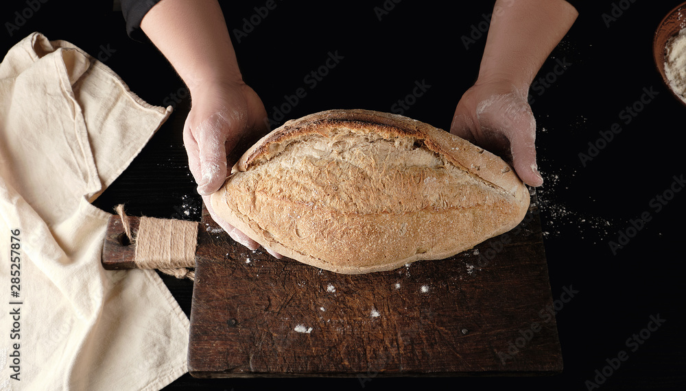 hands holding oval baked wheat flour bread over wooden table