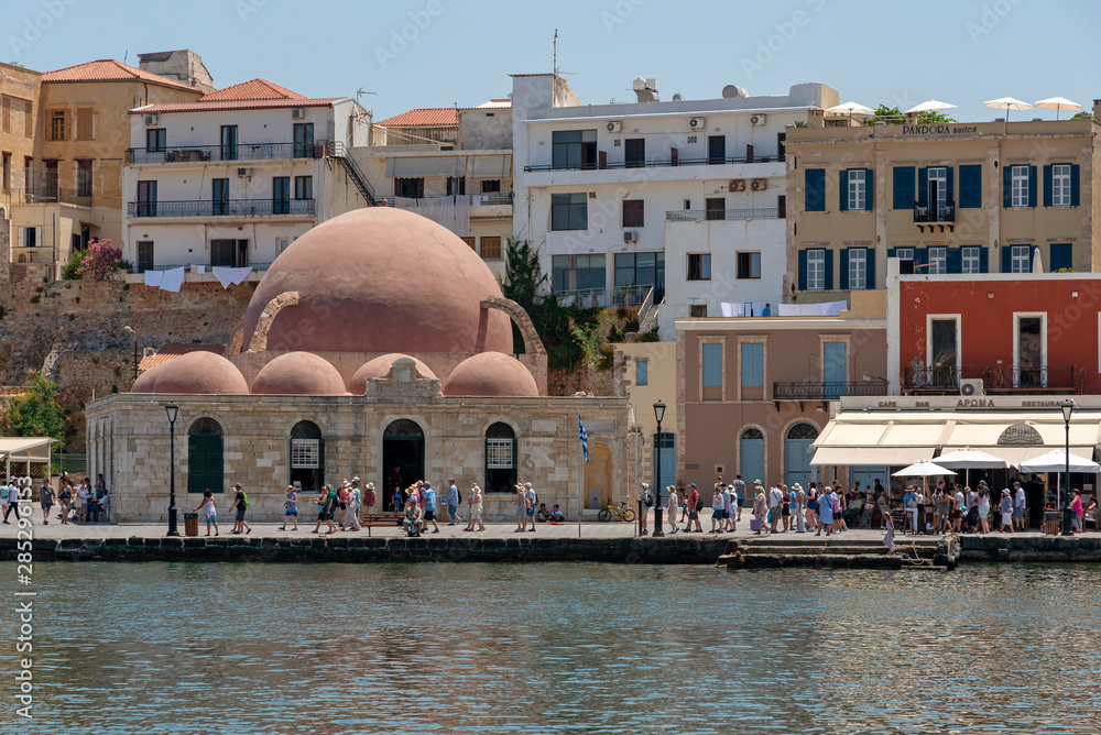 Chania, Crete, Greece, June 2019. Mosque of the Janissaries on the waterfront of the Inner Harbour in Chania