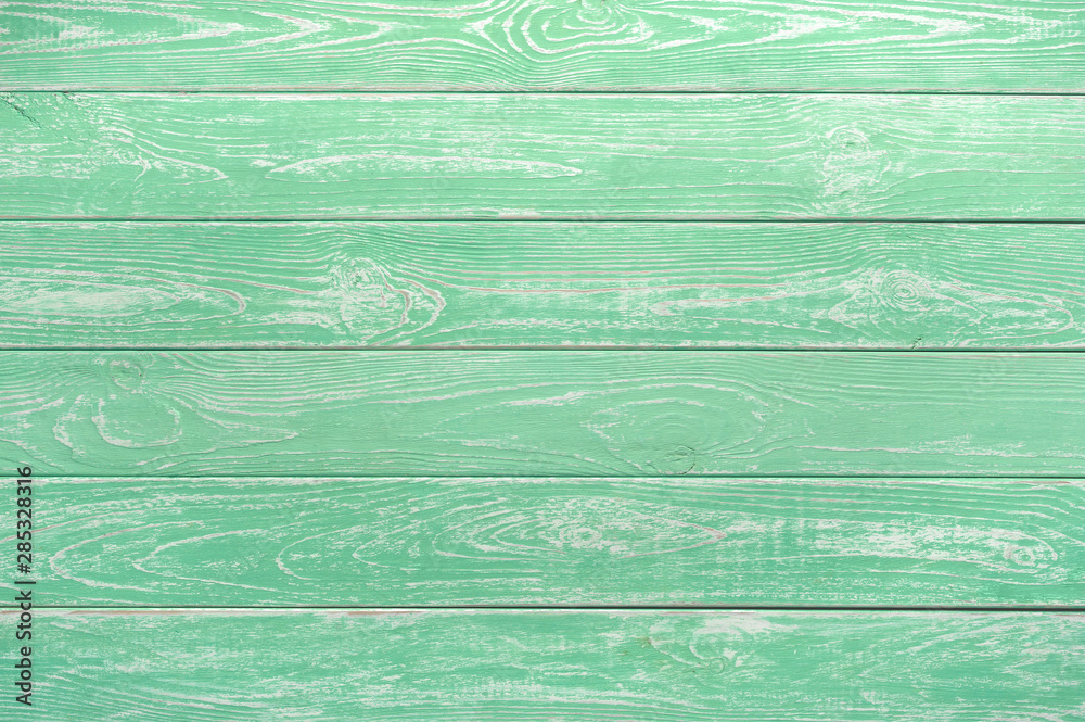 Neo-mint wooden background. Colour of the year 2020. Horizontal green wooden background. Trendy neo mint color