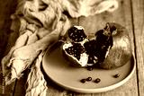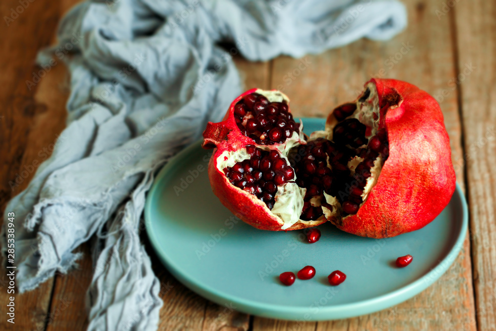 Red, broken pomegranate on a dish. Berry in a plate on a wooden table